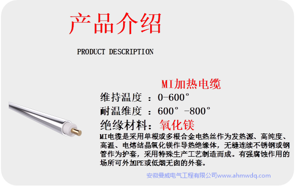 MI電纜是采用 單根或多根合金電熱絲作為發(fā)熱源、高純度、高溫、電熔結(jié)晶氧化鎂作導(dǎo)熱絕緣體,無(wú)縫連續(xù)不銹鋼或銅管作為護(hù)套,采用特殊生產(chǎn)工藝制造而成。有強(qiáng)腐蝕作用的場(chǎng)所可外加PE或低煙無(wú)鹵的外套。